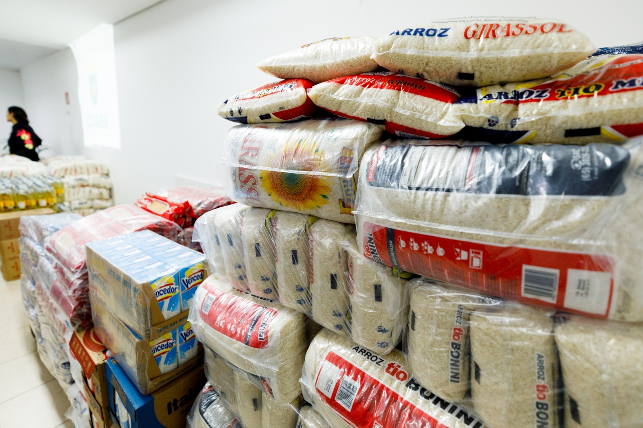 Entre os itens recolhidos estão arroz, açúcar, sal, óleo, feijão, macarrão, farinha de trigo, molho de tomate e caixas de leite.